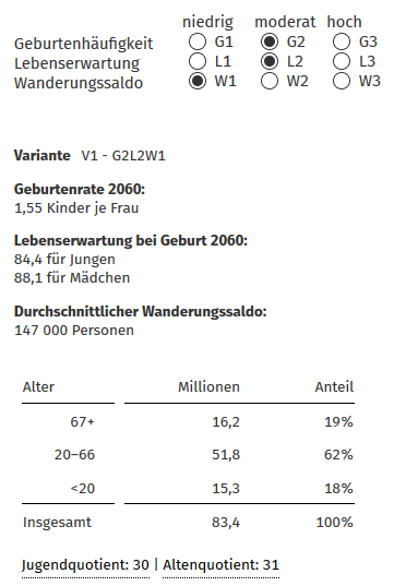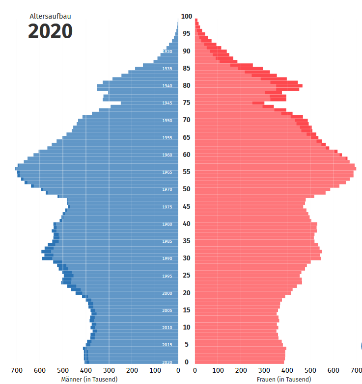 Die Alterung der Bevölkerung in Deutschland wird sich trotz hoher Nettozuwanderung und gestiegener Geburtenzahlen weiter verstärken. In den nächsten 20 Jahren ist durch den aktuellen Altersaufbau ein Rückgang der Bevölkerung im Erwerbsalter und ein Anstieg der Seniorenzahl vorgezeichnet (siehe Animation unten "Altersaufbau der Bevölkerung Deutschlands", Statistisches Bundesamt).